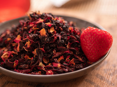 Holunderbeeren, Himbeer- und Erdbeerstücke, Papaya, Korinthen, Hibiskus und Aromen